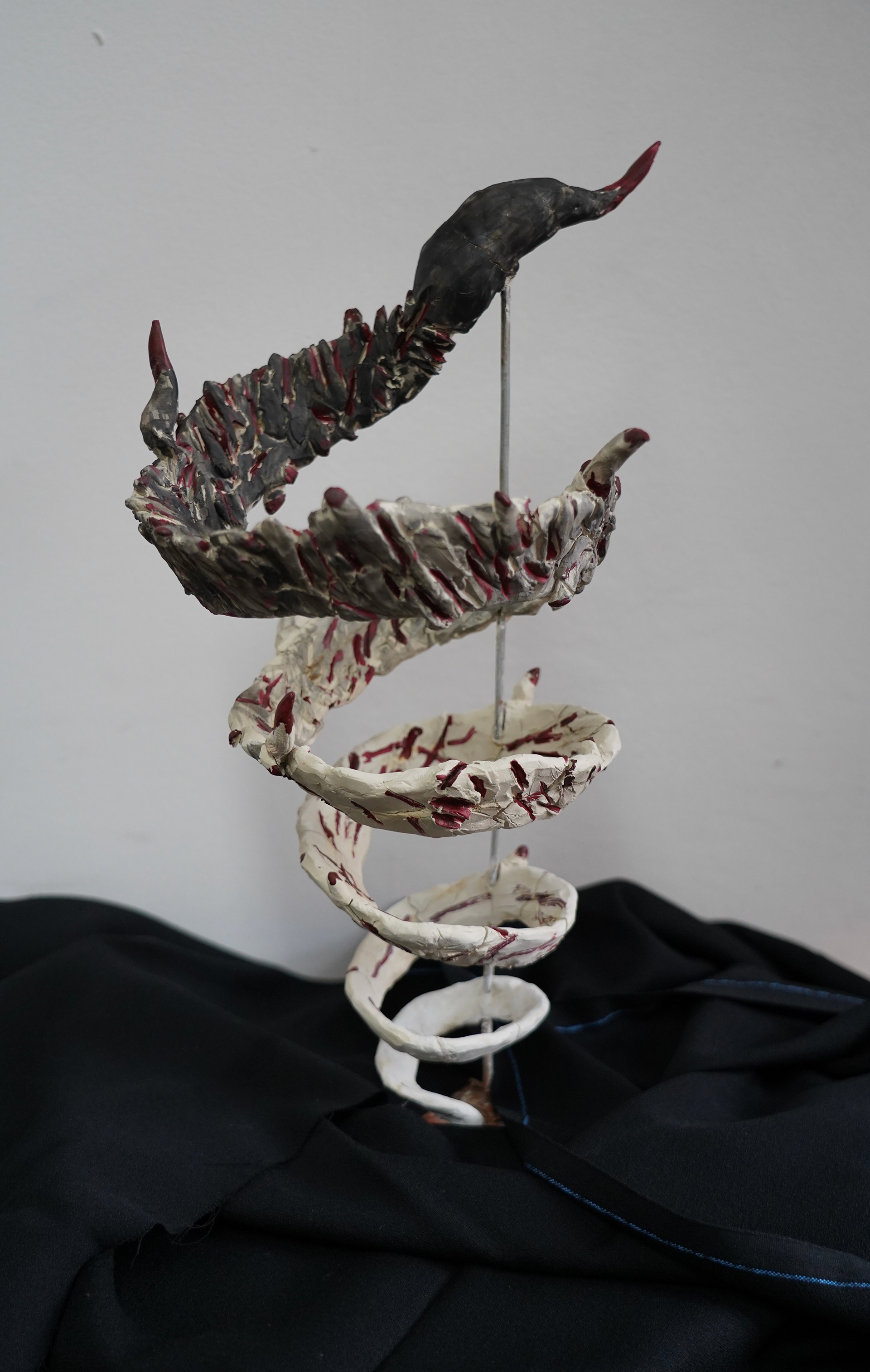 My work represents grief. This idea is mainly framed around the symbolism of the spiral, vortex of grief that relentlessly pulls in its victims. The form of the ribbon allows for a clearer introduction to the idea of things fading with time. I have included it with the help of a few elements - the aforementioned ribbon, as well as spikes and marks in the form of scarring, all of which add up to one united message. Starting from the top, the ribbon of grief decreases in its width, which represents the feeling diminishing over time. This is also represented by the presence of bigger spikes at the top - grief at its most striking and painful, and less prominent wounds at the bottom. This process is natural as the intensity of any emotion connected with a certain matter must, to some extent, weaken, with or without one’s will. On the other hand, the slender start of the spiral represents the phase during which one acknowledges their loss - at first one refuses to accept the harsh realities, but within moments that feeling turns into bitter acceptance and one is able to realise the brutal realities they are faced with.